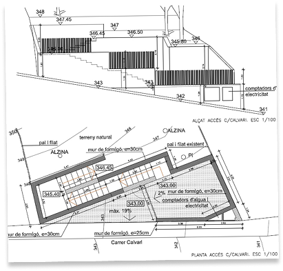 La intervención plantea una única traza en planta con forma de triángulo abierto, donde se ubican todos los servicios y desde donde arranca la escalera que asciende para superar el talud más pronunciado entre la calle Calvari y el resto de la parcela.
