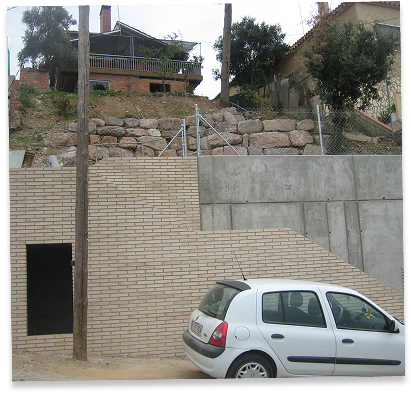 Se construyó un muro de contención a lo largo del límite de la parcela, haciendo un pequeño gesto hacia el interior para crear una ligera terraza en el acceso y reducir así la altura del muro, disminuyendo también su impacto visual desde la calle.
