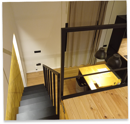 Aprovechamos la altura de la zona central bajo el caballete para improvisar un altillo que puede funcionar como estudio o dormitorio. Respetamos el patio existente, ahora más digno, desde donde se accede al lavadero, separado para evitar el ruido de las máquinas en la vida diaria de este pequeño loft.